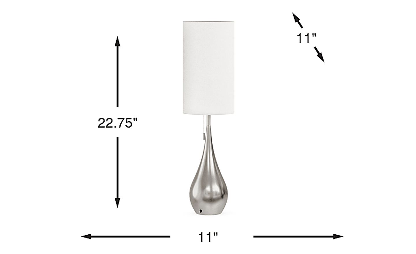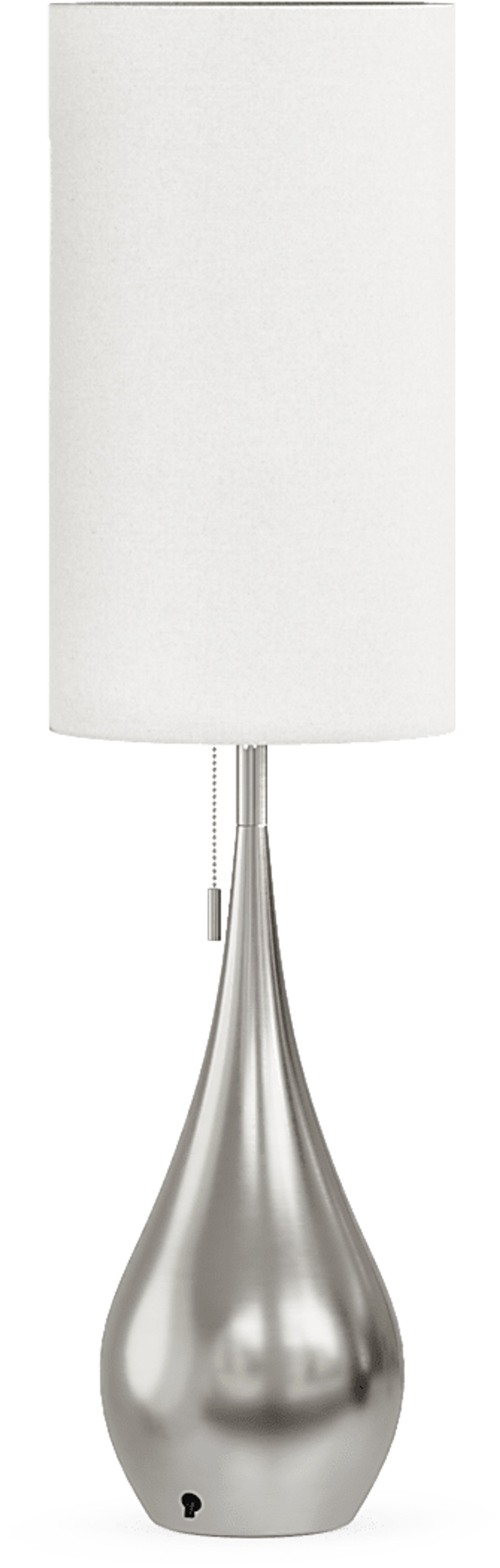 Bring sleek, contemporary lighting to any space with the Sanda Christina lamp. The table lamp's base features a tear-drop design in a chrome-inspired, silver finish. A white, elongated cylinder drum shade provides additional modern appeal while the light pull offers a hint of classic elegance. This lamp takes light bulbs up to 60 watts.