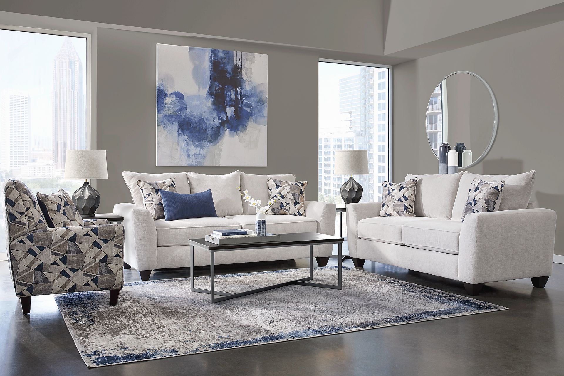 Combining style and versatility, the Sandia Heights living room flaunts a sleek contemporary design that your family is sure to love. Upholstered in soft chenille fabric, the sofa and loveseat boast chic wedge arms and welted seams for a classy look. This comfortable collection's elegant beige color offers timeless style. Jacquard accent pillows feature a geometric pattern that adds a pop of texture, while loose seat and back cushions help your living room last longer. Upholstery: 100% Polyester. Cleaning Instructions: Use water based cleaning agents or foam. Small accent pillow not included. Tables and lamps not as shown in room image.