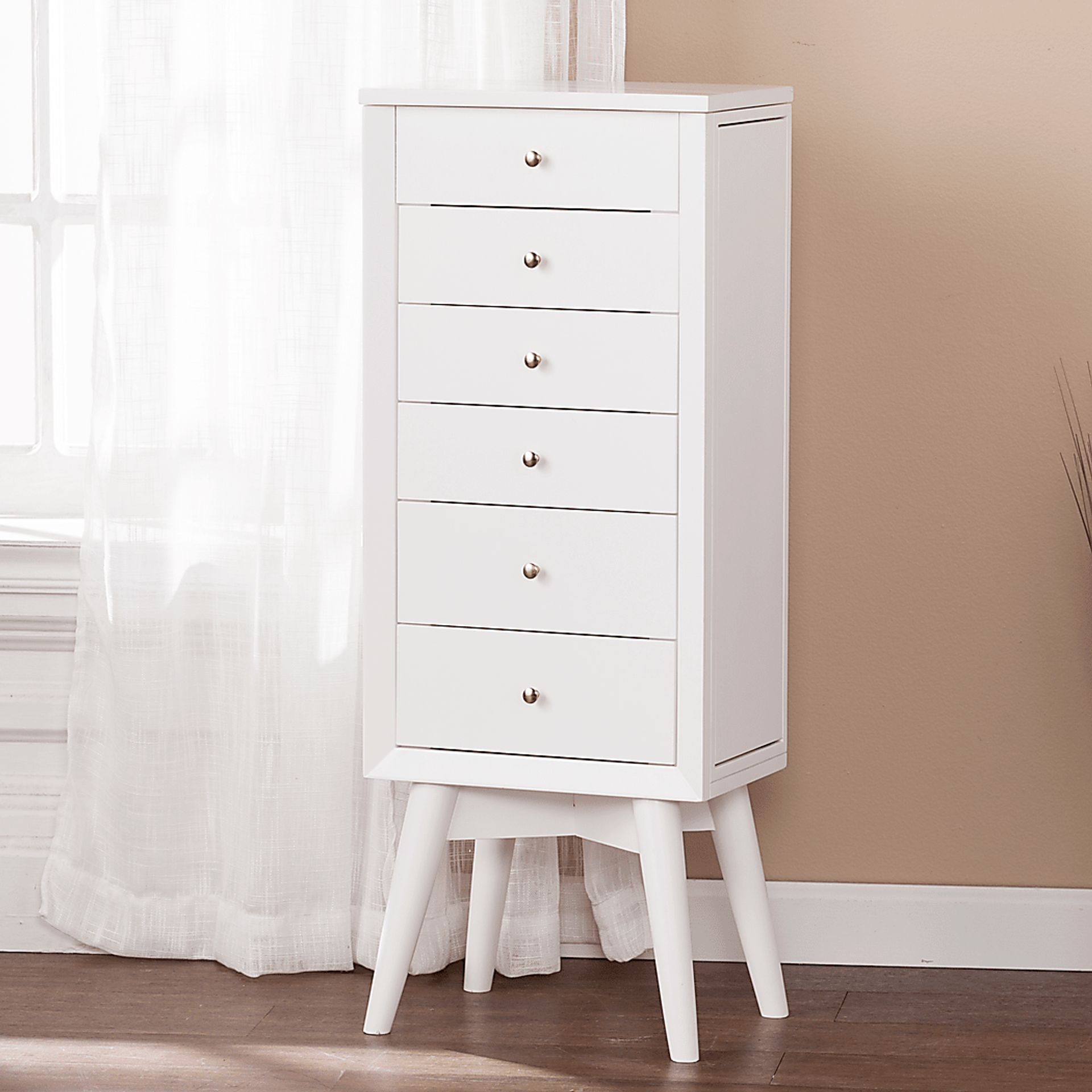 The royal treatment. Your jewelry lives in luxury with this midcentury modern Sandida jewelry armoire. Place your bracelets, rings, and jewels in their dedicated felt-lined drawers. Say goodbye to the tangled mess of necklaces, hang each one on a metal hook. Rest assured your earrings go with your outfit, with the top-opening mirror for last looks before your next event. Customer assembly is required.