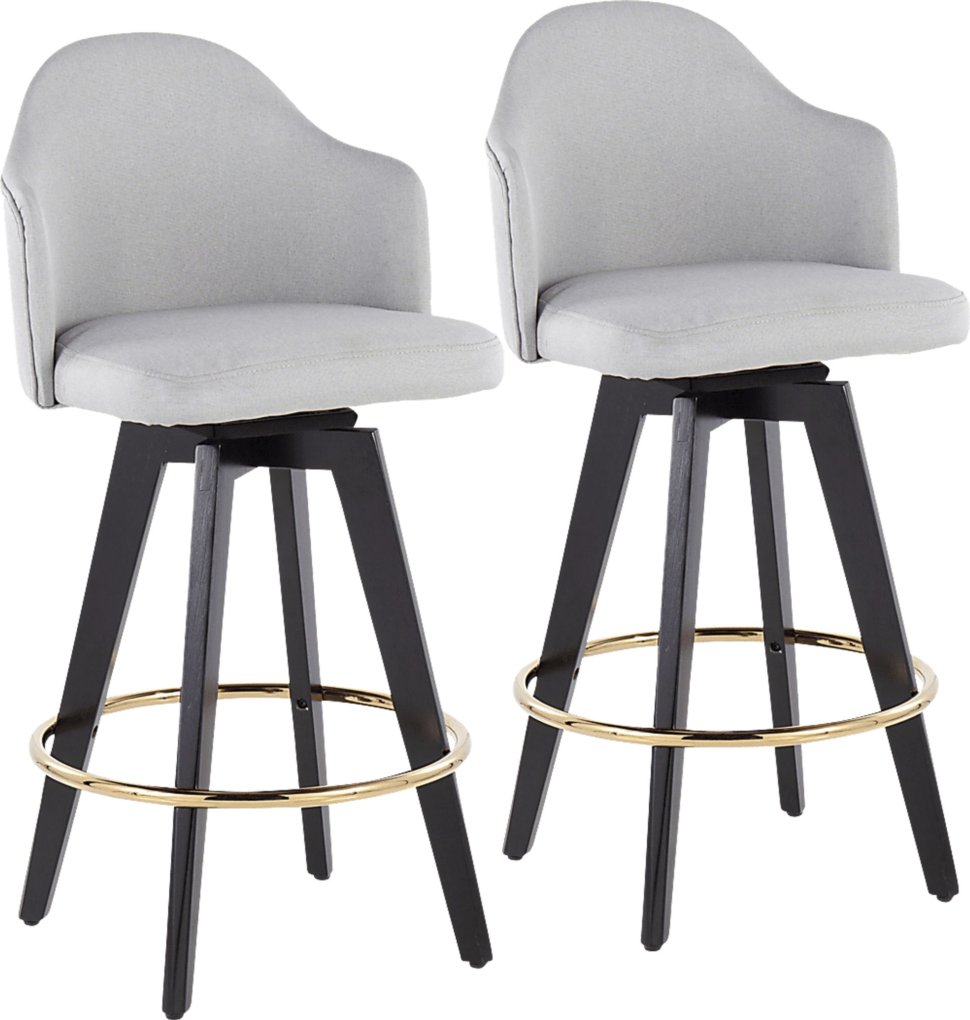 The contemporary charm of the Sandron I counter stool combines sturdy construction with aesthetic appeal. Sleek fabric upholstery is accented by stylish, black wood legs, and a gold metal footrest. This fixed counter height stool has a 360-degree swivel feature. Customer assembly required.