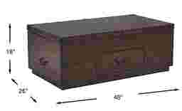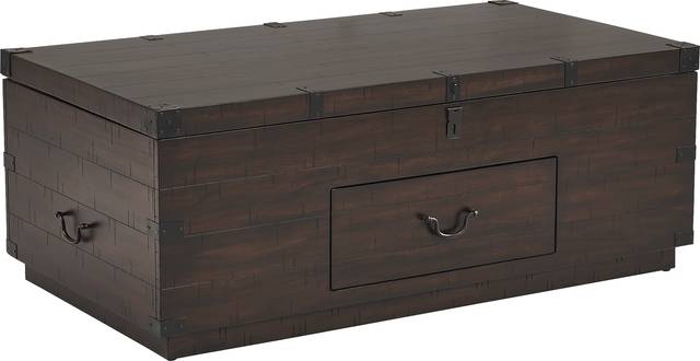 The captivating quality and flair of a time gone by lands right at your feet with the Sandsen Way cocktail table. This traditional piece is styled like a vintage steamer trunk, with a plinth base, acacia veneers in a striped dark brown finish and black metal hardware. In one smooth motion, the entire top lifts to reveal a huge storage space, perfect for making blankets, books, and board games disappear. A drawer on the front provides additional organization space.