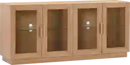 This console features a natural wood finish that reacts to environmental conditions. In humid coastal regions, wood can naturally expand, while in very dry desert climates, it may slightly contract. To maintain the integrity of the wood and the alignment of the mesh doors, we recommend keeping the console in a climate-controlled room and avoiding direct placement in front of heating or cooling vents.