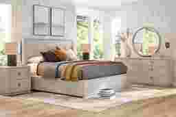 Bold presence and an elevated sense of ease infuse the Drew & Jonathan Santa Clarita bedroom's sculptural shapes and contemporary style. With mindi veneers formed into powerful lines and curves, a reassuring calm comes through its beautiful woodgrain and soothing light gray finish. The bed features a panel headboard and footboard with rounded edges and a plinth style base. Matching pieces carry through the design and offer spacious drawers with unique metal knob hardware. The two drawer nightstands offer USB ports for easy charging. A round beveled mirror mounts to the dresser to complete the ensemble with sophistication. Mattress and foundation (if required) sold separately.