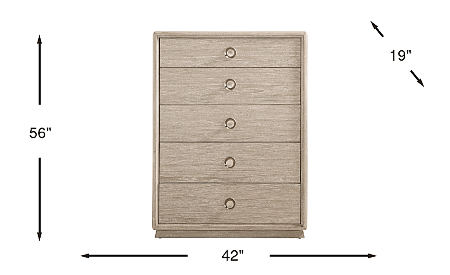 This chest stands 56 inches tall with a 42-inch width, making it a "tallboy" style designed specifically for vertical storage. This is an ideal solution for rooms where floor space is limited, as it provides five deep drawers of organization on a compact footprint. When planning your layout, ensure you have enough clearance for the 19-inch depth plus additional space to fully extend the drawers.