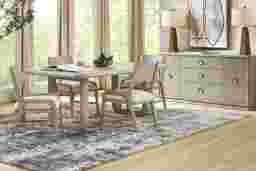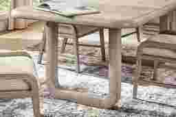 Bold presence and an elevated sense of ease infuse the Drew & Jonathan Santa Clarita dining table's sculptural shapes, its mindi veneers formed into powerful lines and curves radiating reassuring calm through beautiful woodgrain and a soothing light gray finish. Contemporary shapes define the impressive 78-inch rectangular table at the center of this collection, its double pedestal base showcasing a stunning open design.
