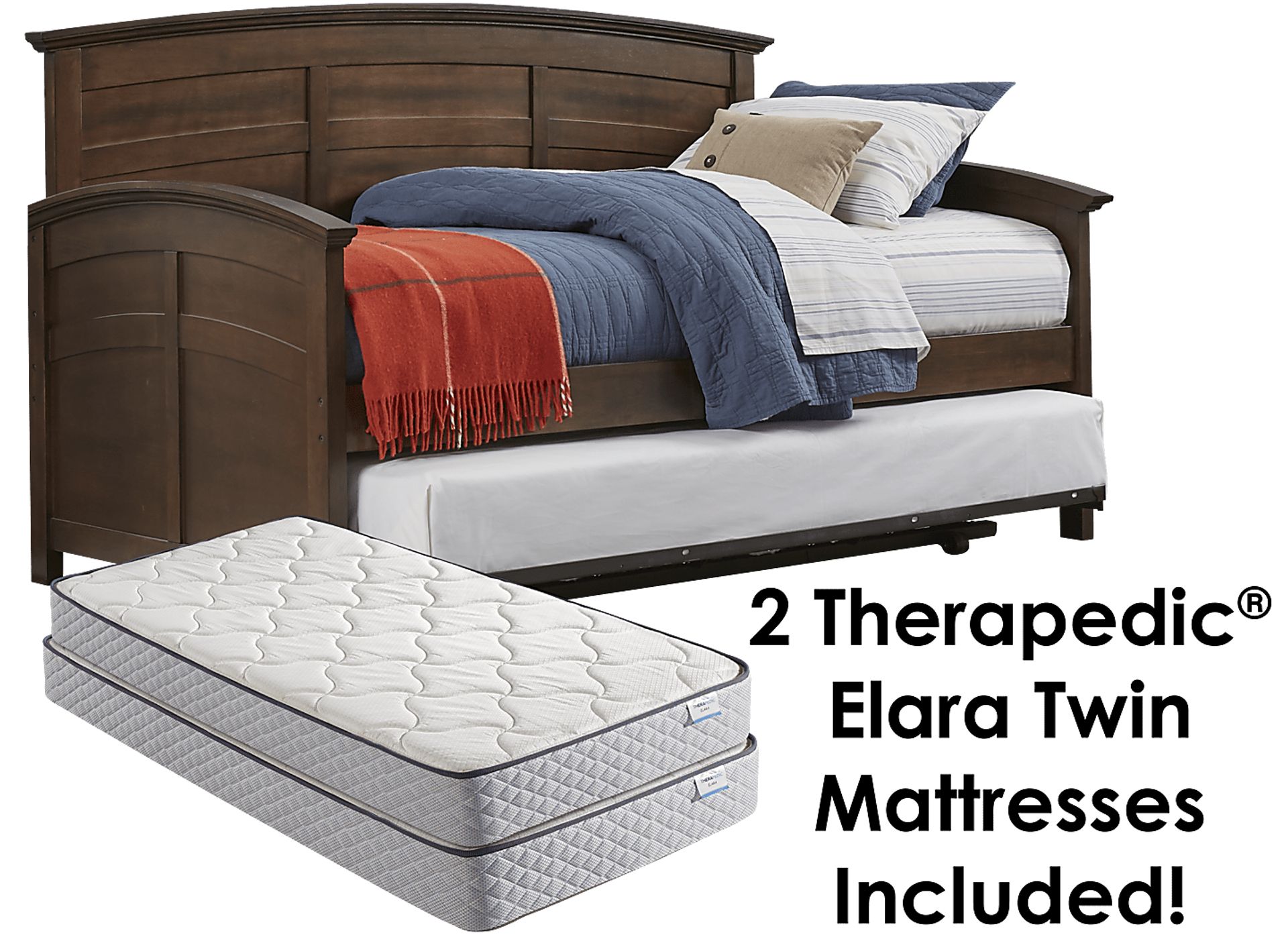 The Santa Cruz daybed is a stylish addition to any room. The twin-sized bed is quality crafted of pine solids and veneers with a neutral brown finish and features a gently curved back and sides for an updated twist on a classic design. An included metal trundle that pops up and two Therapedic Elara mattresses makes sleepovers a breeze.