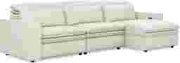 Uptown style meets weekend mode with the Drew & Jonathan Santorini sectional's spacious seating and high-tech functionality, offering the perfect blend of chic style and cozy comfort. Upholstered in ice-white top grain leather where the body touches, this sectional features stylish track arms and attached double pillow pad seat cushions for a sophisticated feel. The dual power reclining feature allows adjustment in the headrest and footrest for personalized support and the ultimate lounging experience. Upholstery: Top grain leather where the body touches and polyurethane fabric sides and backs.