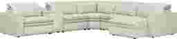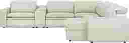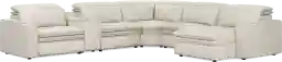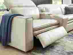 Uptown style meets weekend mode with the Drew & Jonathan Santorini sectional's spacious seating and high-tech functionality, offering the perfect blend of chic style and cozy comfort. Upholstered in ice-white top grain leather where the body touches, this sectional features stylish track arms and attached double pillow pad seat cushions for a sophisticated feel. The dual power reclining feature allows adjustment in the headrest and footrest for personalized support and the ultimate lounging experience. The media console includes cupholders, reading light, and a storage compartment for easy access to your unwinding necessities. Upholstery: Top grain leather where the body touches and polyurethane fabric sides and backs.