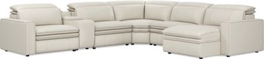 Uptown style meets weekend mode with the Drew & Jonathan Santorini sectional's spacious seating and high-tech functionality, offering the perfect blend of chic style and cozy comfort. Upholstered in ice-white top grain leather where the body touches, this sectional features stylish track arms and attached double pillow pad seat cushions for a sophisticated feel. The dual power reclining feature allows adjustment in the headrest and footrest for personalized support and the ultimate lounging experience. The media console includes cupholders, reading light, and a storage compartment for easy access to your unwinding necessities. Upholstery: Top grain leather where the body touches and polyurethane fabric sides and backs.