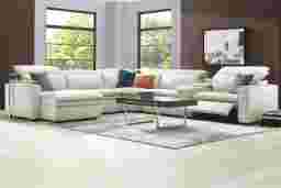 Uptown style meets weekend mode with the Drew & Jonathan Santorini sectional's spacious seating and high-tech functionality, offering the perfect blend of chic style and cozy comfort. Upholstered in ice-white top grain leather where the body touches, this sectional features stylish track arms and attached double pillow pad seat cushions for a sophisticated feel. The dual power reclining feature allows adjustment in the headrest and footrest for personalized support and the ultimate lounging experience. The media console includes cupholders, reading light, and a storage compartment for easy access to your unwinding necessities. Upholstery: Top grain leather where the body touches and polyurethane fabric sides and backs.