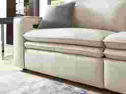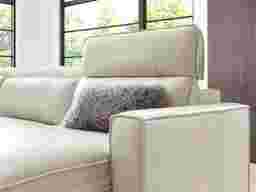 Uptown style meets weekend mode with the Drew & Jonathan Santorini sectional's spacious seating and high-tech functionality, offering the perfect blend of chic style and cozy comfort. Upholstered in ice-white top grain leather where the body touches, this sectional features stylish track arms and attached double pillow pad seat cushions for a sophisticated feel. The dual power reclining feature allows adjustment in the headrest and footrest for personalized support and the ultimate lounging experience. Upholstery: Top grain leather where the body touches and polyurethane fabric sides and backs.