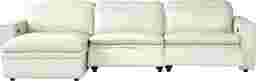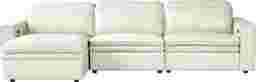 Uptown style meets weekend mode with the Drew & Jonathan Santorini sectional's spacious seating and high-tech functionality, offering the perfect blend of chic style and cozy comfort. Upholstered in ice-white top grain leather where the body touches, this sectional features stylish track arms and attached double pillow pad seat cushions for a sophisticated feel. The dual power reclining feature allows adjustment in the headrest and footrest for personalized support and the ultimate lounging experience. Upholstery: Top grain leather where the body touches and polyurethane fabric sides and backs.
