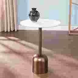Mix up your living room look with this sleek Sapwood side table. Metallic copper base and authentic, natural marble tabletop create an eclectic take on glam style, while a vintage copper finish showcases a classic accent table silhouette. Slide this unique, mixed-materials occasional table next to your favorite chair in the reading nook, entry bench in the hall, or sofa in the den. Customer assembly is required.