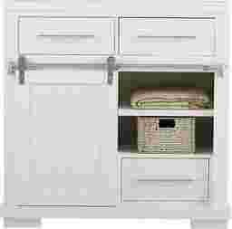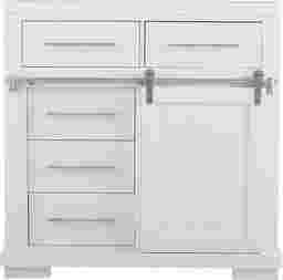 Featuring six drawers and open shelving space, the Sarasota Springs bureau offers versatile storage space. Crafted of pine solids and oak veneers in a fresh white finish, this bureau features a sliding barn door below the two upper drawers for a stylish, updated look. Elongated brushed metal hardware and beadboard paneling adds to the transitional design.