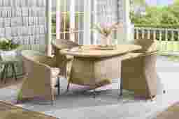 From the first breath of spring through the breezy comfort of autumn and beyond, the Sarina Bay collection brings the pleasures of the season to life. A powder-coated aluminum frame wrapped in all-weather wicker showcases a radiant natural color and vibrant texture in the sweeping curves of this 71" long dining table. Completing the piece is a slatted solid teak tabletop.