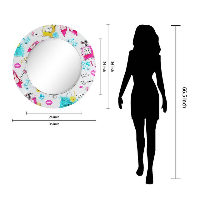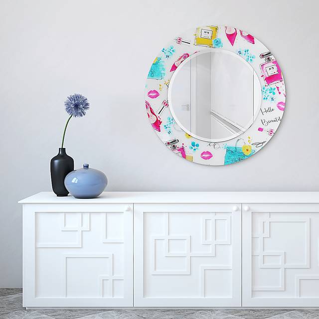 The Saryl round mirror is raised on a bevel, standing out from the tempered art glass surround. The piece uses various young and trend motifs, such as perfume, shoes and lipstick to create a fashionable, feminine feel. The colors used are gentle and relaxing, so this is an ideal mirror for a light and airy room.