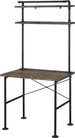 The Sateena desk features a rustic oak finish top, metal base, and 2 tier shelf open storage. This water pipe style industrial desk is ideal for any hip loft space. Customer assembly required.