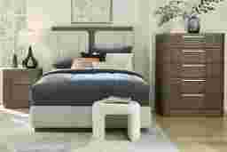 Boldly confident with a gentle touch of softness, the Sausalito bedroom from Drew & Jonathan punctuates the day with a quiet double-take at its red carpet-worthy looks. A commanding headboard crafted with oak veneers in a brown finish separates two upholstered panels that showcase beige fabric and soft curves. The footboard echoes the design with an upholstered upper panel and a plinth-style wood foot. Matching pieces feature rounded edges, exquisite reeded details and drawers with low-profile metal pulls. The two-drawer nightstand features USB charging ports mounted to the back, providing convenient overnight power for your devices. Mattress and foundation (if required) sold separately. Bed shown is queen size.