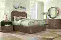 Boldly confident with a gentle touch of softness, the Sausalito bedroom from Drew & Jonathan punctuates the day with a quiet double-take at its red carpet-worthy looks. A commanding headboard crafted with oak veneers in a brown finish is trimmed with an outer arch of stunning reeded details. The footboard echoes the carved design and stands on a plinth-style foot. Matching pieces feature rounded edges, exquisite reeding and drawers with low-profile metal pulls. Mattress and foundation (if required) sold separately.