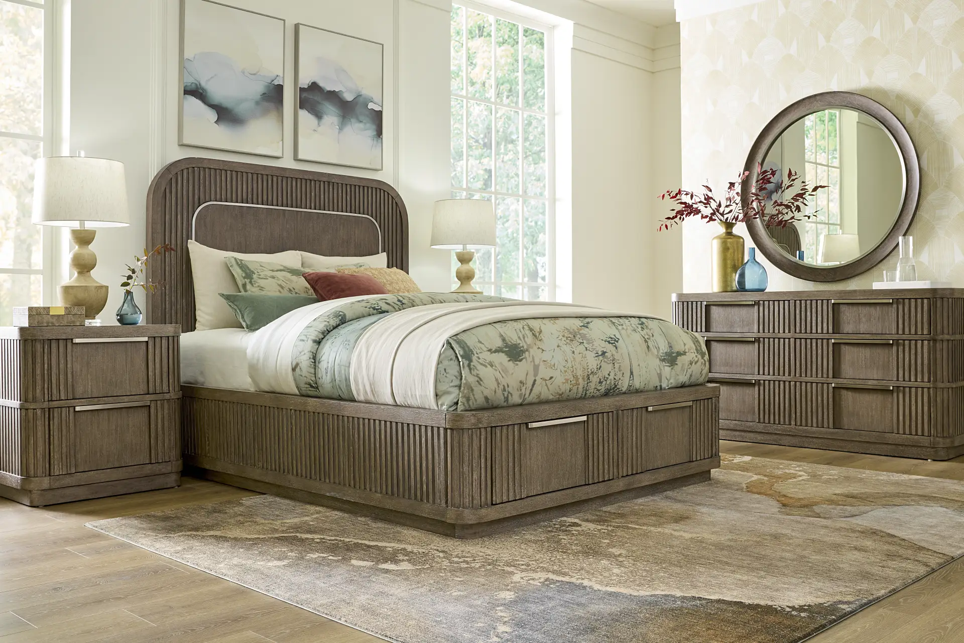 Boldly confident with a gentle touch of softness, the Sausalito bedroom from Drew & Jonathan punctuates the day with a quiet double-take at its red carpet-worthy looks. A commanding headboard crafted with oak veneers in a brown finish is trimmed with an outer arch of stunning reeded details. The footboard echoes the carved design and stands on a plinth-style foot. Storage drawers at the foot of the bed feature stylish low-profile metal pulls. The matching dresser features rounded edges, exquisite reeded details and a mirror. Mattress and foundation (if required) sold separately.