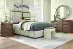 Boldly confident with a gentle touch of softness, the Sausalito bedroom from Drew & Jonathan punctuates the day with a quiet double-take at its red carpet-worthy looks. A commanding headboard crafted with oak veneers in a brown finish separates two upholstered panels that showcase beige fabric and soft curves. The footboard echoes the design with an upholstered upper panel and a plinth-style wood foot. Matching pieces feature rounded edges, exquisite reeded details and drawers with low-profile metal pulls. Each two-drawer nightstand features USB charging ports mounted to the back, providing convenient overnight power for your devices. Mattress and foundation (if required) sold separately. Bed shown is queen size.