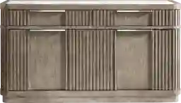 Boldly confident with a gentle touch of softness, the Sausalito buffet from Drew and Jonathan punctuates the day with a quiet double-take at its red carpet-worthy looks. Contemporary in style, this piece's commanding silhouette is crafted using hardwood and poplar solids with oak veneers while the channeled detailing and recessed door embellishments add visually provocative contours. The drawers are constructed of French joints on front and English on back, complimented by ball bearing glides with full extension for ease of opening and maximum use of the available space. Hidden behind its doors is a space to store wine as well as shelves that offer plenty of room for necessities. Metal pulls add a unique contrast while a stone inlay on top provides the final, authoritative detail.