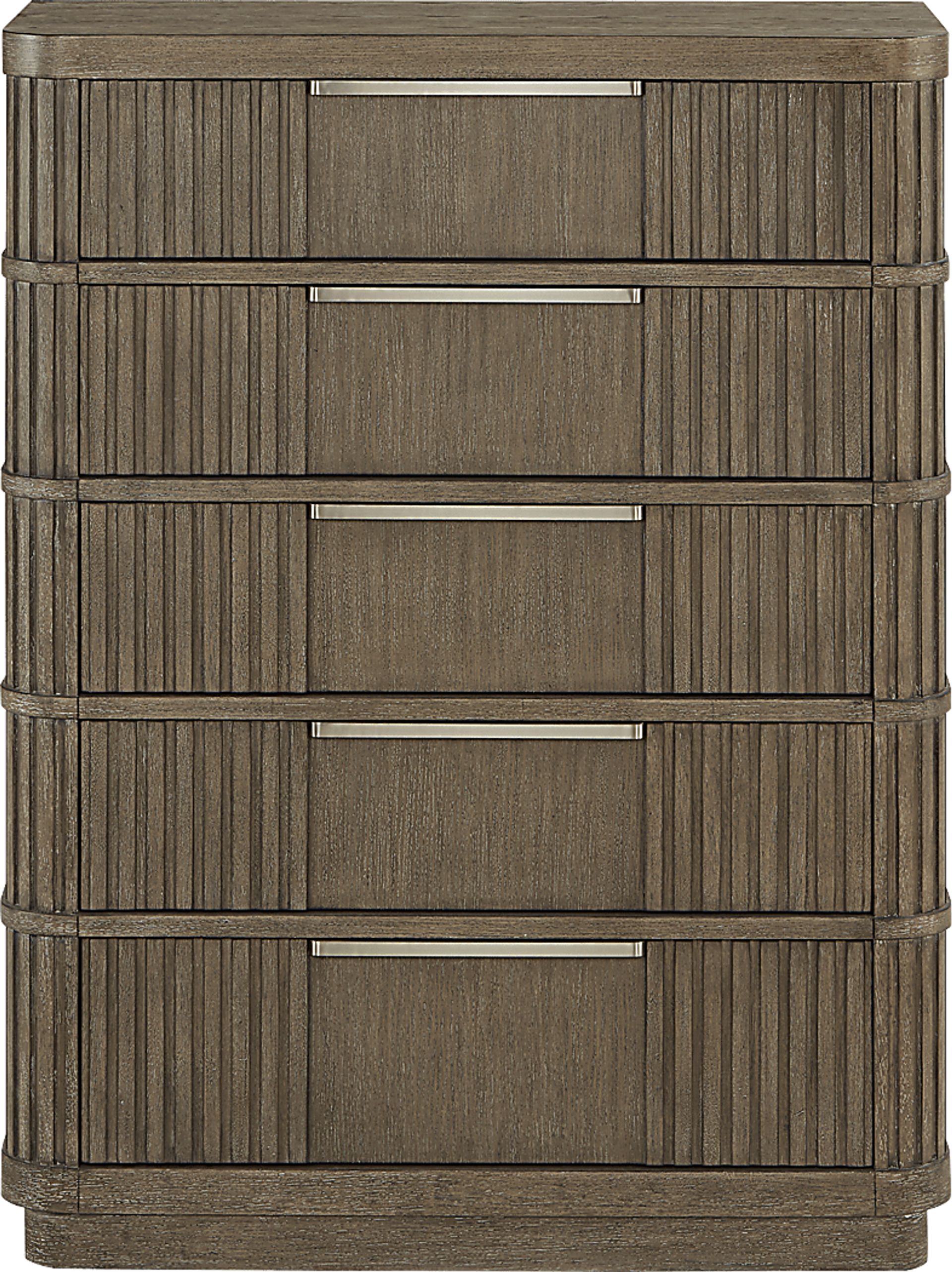 Boldly confident with a gentle touch of softness, the Sausalito chest from Drew & Jonathan punctuates the day with a quiet double-take at its red carpet-worthy looks. This accent's commanding silhouette is crafted with oak veneers in a brown finish trimmed with stunning reeded details throughout. Low-profile metal pulls and rounded edges add visual contrast, and the look is completed with a plinth base.