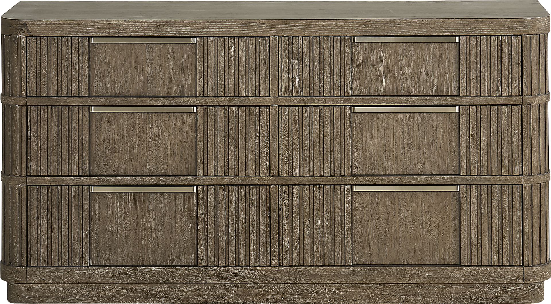 Boldly confident with a gentle touch of softness, the Sausalito dresser from Drew & Jonathan punctuates the day with a quiet double-take at its red carpet-worthy looks. This accent's commanding silhouette is crafted with oak veneers in a brown finish trimmed with stunning reeded details throughout. Low-profile metal pulls and rounded edges add visual contrast, and the look is completed with a plinth base.