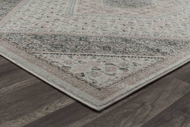 This polypropylene, power-loomed rug, with its majestic motif, will give your space a graceful, dainty touch that won't overpower your other decor pieces. The Sauveer rug features an ivory, pink, and gray color palette that adds to its delicate look. The half-inch pile was constructed for both durability and softness while also boasting a subtle shine. Show this exquisite rug off in your living or dining room. For maintenance, vacuum regularly.