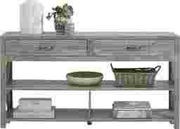 This piece combines its rustic aesthetic with practical functionality, featuring two integrated drawers. These are perfect for discretely organizing smaller items such as keys, remotes, or mail to help maintain a clutter-free environment. Additionally, the ample open space beneath the drawers offers a versatile secondary storage area for larger decorative baskets or stacked books.