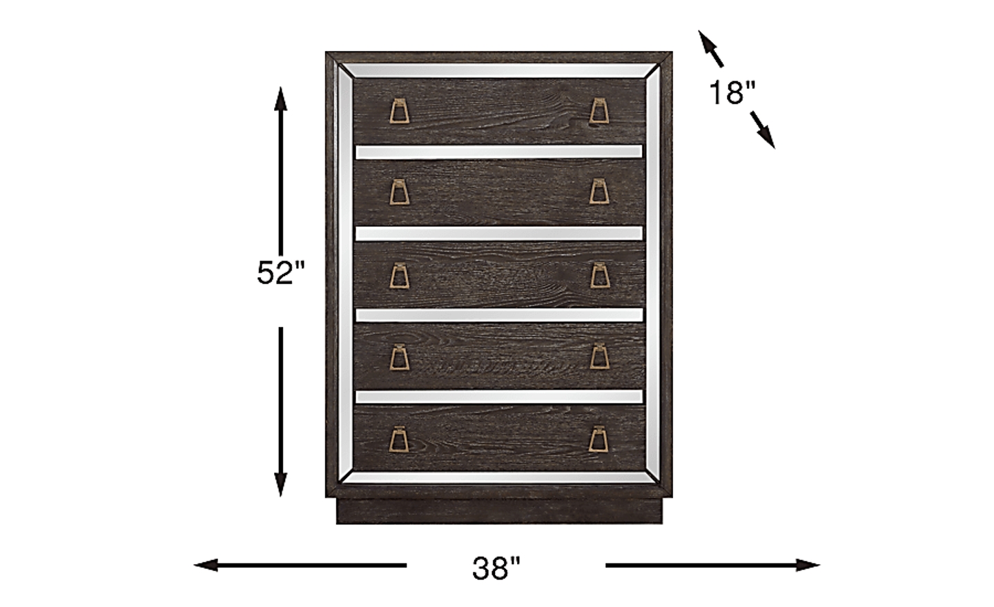 Like silver moonlight glistening softly over still waters to reflect nature's mesmerizing display, the Savoy Creek collection quietly elevates the room with sculptural forms and reflective accents. Contemporary in style, this five-drawer chest is crafted with oak veneers in an ash gray finish and features beautiful mirror accent borders that shimmer with tranquil elegance. Gold-finished handles, styled like sleek door knockers, and a plinth-style base complete the look with a refined, modern edge.