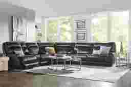 The art of relaxation is painted in the soft, rounded curves of the Scarborough sectional, its rich, unassuming luxuriousness filling any space with contented sighs. Transitional in design and upholstered in black top grain leather where the body touches, it features sumptuous padded arms along with padded outside arms and backs. Its attached seat and back cushions are embellished with generous double-stitching a deep horizontal stitch across the back for added comfort and visual appeal. Dual power reclining functions allow adjustments in the head and extended footrest via a patented zero gravity mechanism for the ultimate lounging experience. USB-A and USB-C charging ports are located both on the side switch and in the console, which also contains wireless charging and an LED light. A sliding cupholder completes the list of tech and relaxation features. Top grain leather where the body touches. Polyurethane sides and back.