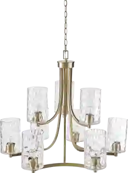 Introducing the Scovel Cay Brass Chandelier. This transitional style chandelier adds a modern touch with its sleek antique brass finish, exuding luxury. It features 9 textured glass cylindrical shades and an adjustable chain for customizable hanging heights. This fixture is perfect for dining rooms, foyers, or living areas. Illuminate your space in style with this stunning centerpiece. Professional installation by an electrician is recommended.
