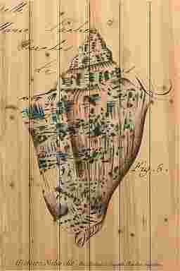 The Sea Gems III artwork features a seashell drawn in the style of a scientific sketch, as a naturalist would record it for study. However, there is a historical sense to the image which melds perfectly with the more artistic elements of the sketch, for this marriage of scientific and artistic calls to mind an era of discovery. The many bumps and textures of the shell tell tales of its journey. Seen in close detail with faded shades of blue and pink, this becomes not just a shell that we might crush underfoot at the beach, but a tiny craft intended for a whimsical voyage.