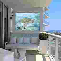 Surveying the ocean floor for a tasty morsel, the big fellow floating through the Sea Life Turtle outdoor canvas is a curious and friendly face to brighten up any space in need of some coastal inspiration. A sea turtle's earthy greens and browns contrast with the crystal blue of the ocean on a sunny day on an artist canvas gallery wrapped on all-weather poly-vinyl stretcher bars and coated with UV- and waterproof lacquer to prevent fading. Designed to withstand 60 mile per hour winds, this print includes simple and effective hardware for outdoor installation. This outdoor canvas art can be placed in any outdoor location with direct exposure to the elements.