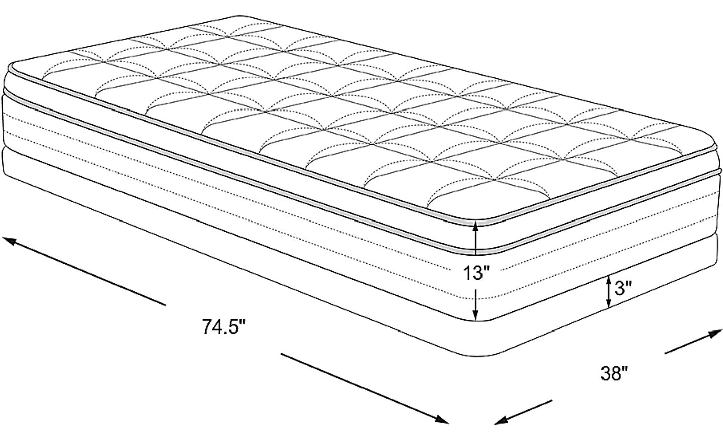mattress: 74.5"l x 38"w x 13"h, foundation: 5"h