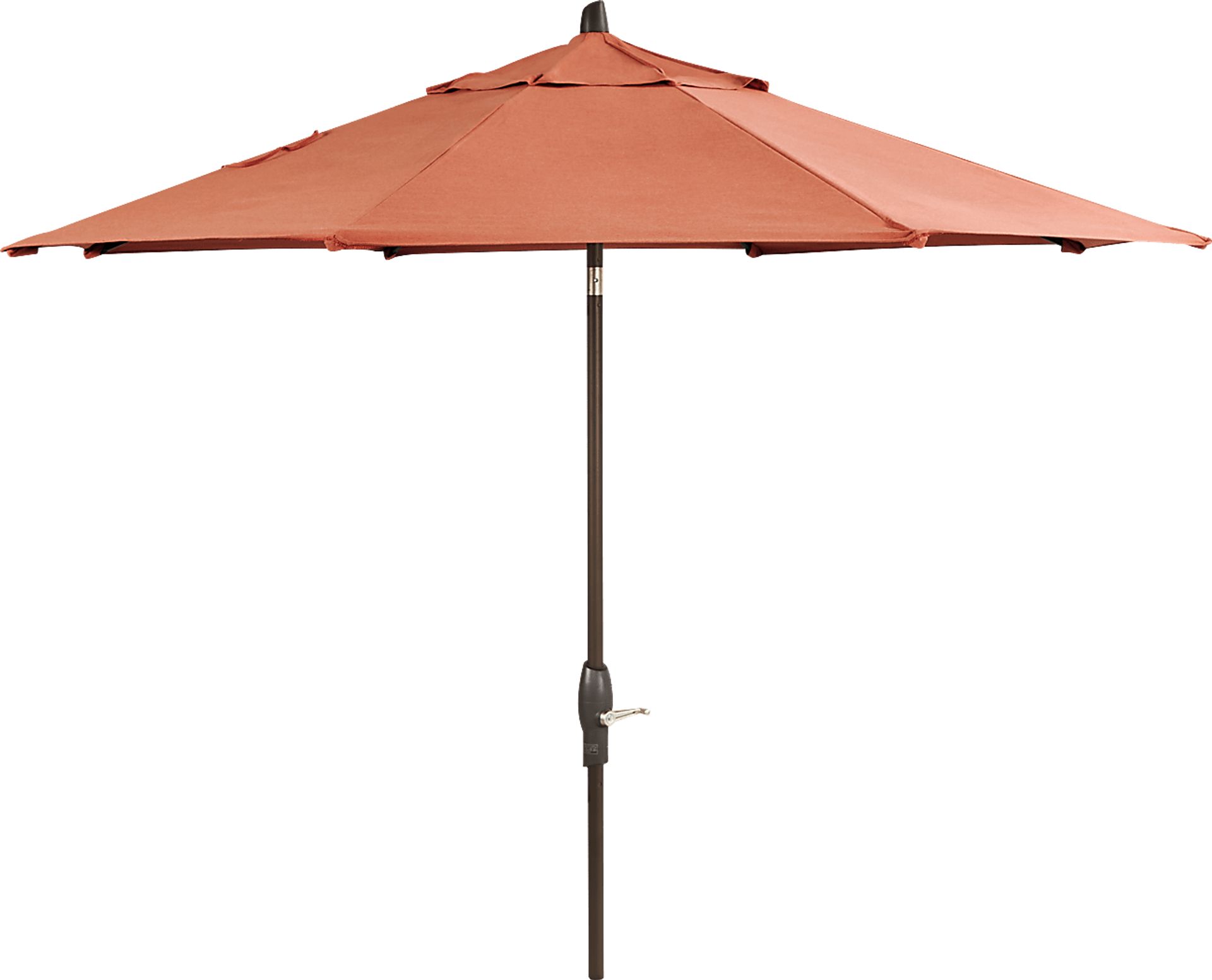 Providing the perfect shade coverage for up to 54 inch tables, the Seaport market style umbrella is a wonderful choice. This 9' octagon shaped auto tilt umbrella offers high UV protection with long lasting, durable, solution-dyed Sunbrella fabric in a persimmon color. With a rotation of the crank handle, the dynamic tilt mechanism ensures the 100% Kevlar lift cord will power the umbrella into a full tilt position. The sturdy aluminum pole is rendered in a powder coated bronze finish. 100% Sunbrella fabric. To clean Sunbrella fabric remove dirt and spray on cleaning solution (water and mild soap), then use a soft bristle brush or sponge. Allow cleaning solution to soak into fabric and rinse thoroughly until soap residue is removed. Air dry. Do not dry clean.