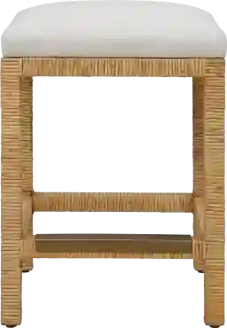 This Seeneh Natural Counter Stool has casual and coastal styling wrapped in natural rattan and upholstered in an off white linear textured polyester with a toxin-free, eco friendly treatment to help resist water based stains. Complete with an antique gold kick plate.