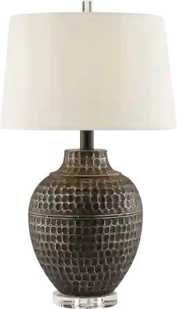 The combination of a dark bronze hammered texture and a clean white linen shade allows this lamp to bridge the gap between several design aesthetics. It serves as a sophisticated focal point in contemporary rooms, adds an organic touch to rustic or farmhouse interiors, and complements the metallic accents often found in industrial-inspired spaces. For a cohesive look, our experts recommend pairing it with other earth tones or natural wood furniture.