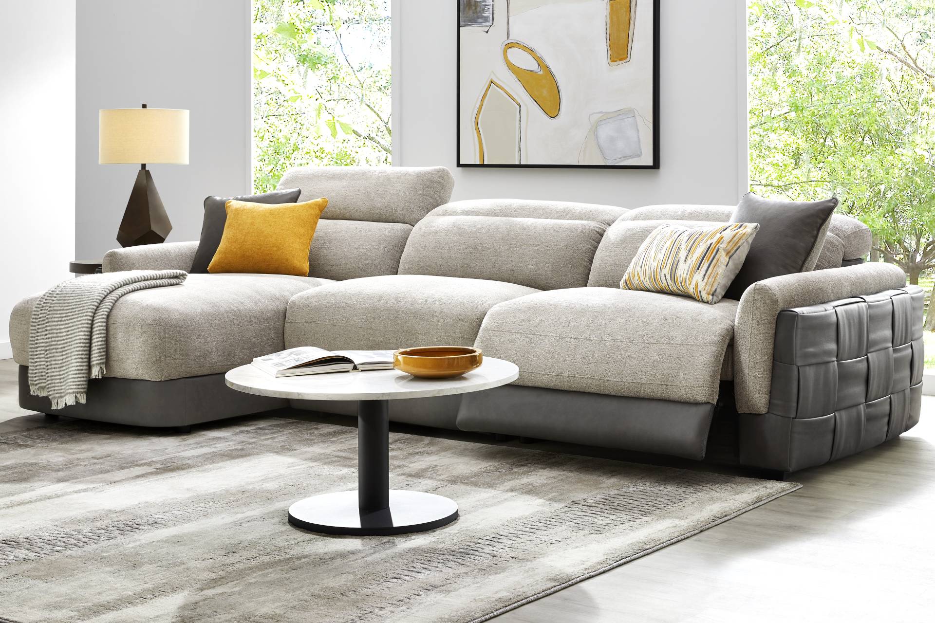 Mixing three parts wow with two parts elegance for a wholly classy look, the Seneca Falls sectional from Cindy Crawford Home turns each encounter into a stylish occasion to remember. Unique dual upholstery is enhanced with a variety of textures, from the woven seats in beige to the base and basket-weave sides in a smooth dark gray fabric. Dual power seats feature adjustable headrests and footrests, and the end chaise can be raised for optimal comfort. Hidden switches keep recline controls close at hand while preserving the sleek modern look. Includes right arm recliner, armless recliner, and left arm chaise recliner. Upholstery: 100% polyester.
