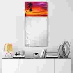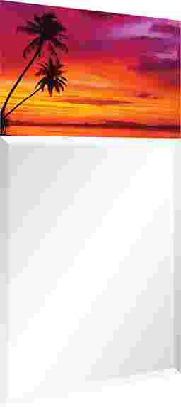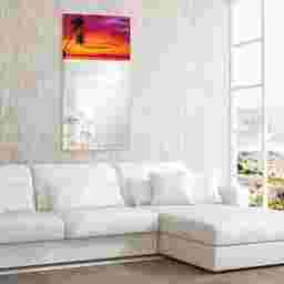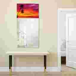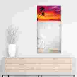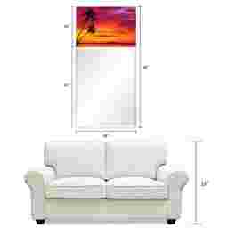 The Serene Sunset mirror features a frame-less, free floating, tempered glassthat was inspired by the French technique of Verre Eglomise in which artist's literally painted the back of clear glass so that when viewed from the front the painting is brought to life under the depth of the glass. This piece of a beautiful beach sunset takes that same tempered glass and displays a beveled mirror in front of it. Two strong steel hangers are attached to the back of the mirror for a quick and easy vertical installation.