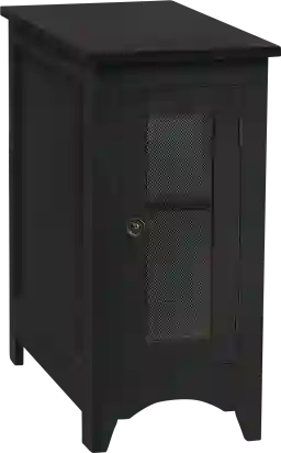 This charming 24 inch high Serin Black End Table that combines both practicality and stylishness. With an antique black veneer finish and subtle red distressing all around, this fashionable side table with an easy to clean top is perfect to set next to a sofa or chair in your living room, or setup a reading lamp on top and place in your bedroom as a cozy nightstand. This transitional style accent table with a space saving design has plenty of storage with a closed cabinet, complimented with a round metal knob in a bronze finish and a metal mesh insert on the cabinet door giving you a quiet peak inside. The fixed shelf inside can be used to neatly stack books, storage baskets or other essential items. Durably designed with solid wood legs and easy to assemble with full illustrated instructions and hardware, you will enjoy this fashionable style narrow end table for years to come. Customer assembly required.
