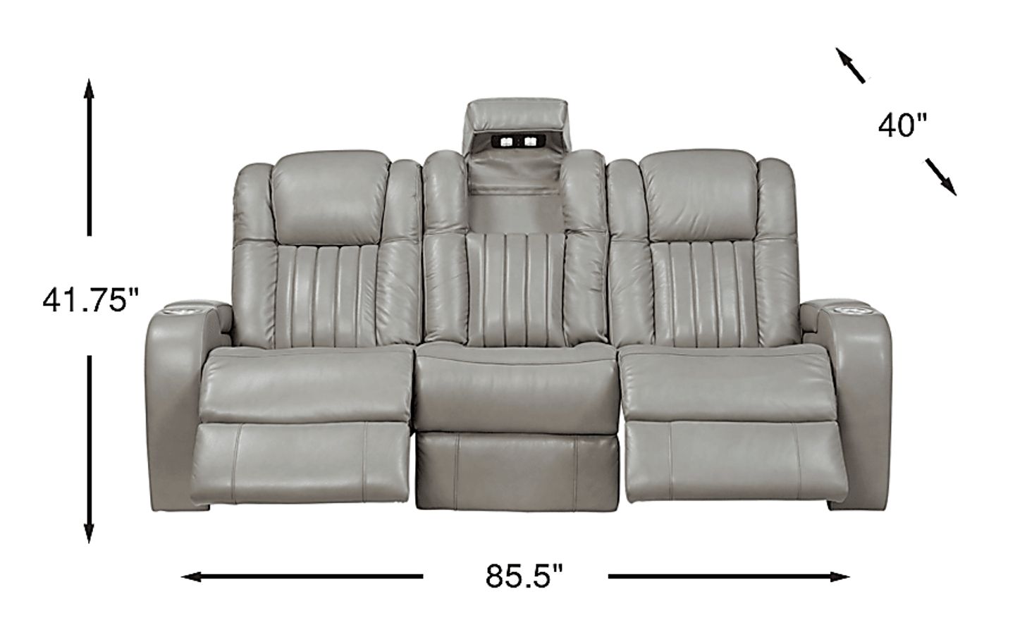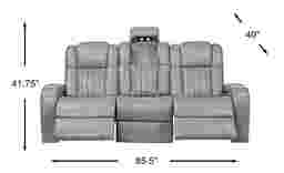 Take lounging to the next level with the Servillo power reclining sofa. Packed with features, this contemporary platinum colored sofa is upholstered in luxurious top grain leather wherever the body touches. The middle seat remains stationary while the seating on each side boasts dual power reclining headrests and power chaise footrests. Deluxe features include touch activation and a memory switch for easily returning to favorite positions. The power headrest element provides three extra inches of back height that tilts forward to create the most comfortable position for watching television. A center-mounted fold-down table boasts twin cupholders and a pop-up media strip with two A/C adaptors. The center headrest can be raised to reveal handy reading lights. A USB port on each side of the sofa provides connectivity while hidden storage and lighted cupholders are conveniently built-in to each armrest. Top Grain Leather Where the Body Touches and Vinyl Sides and Backs.