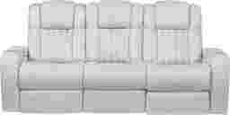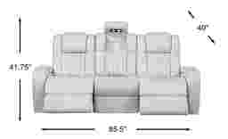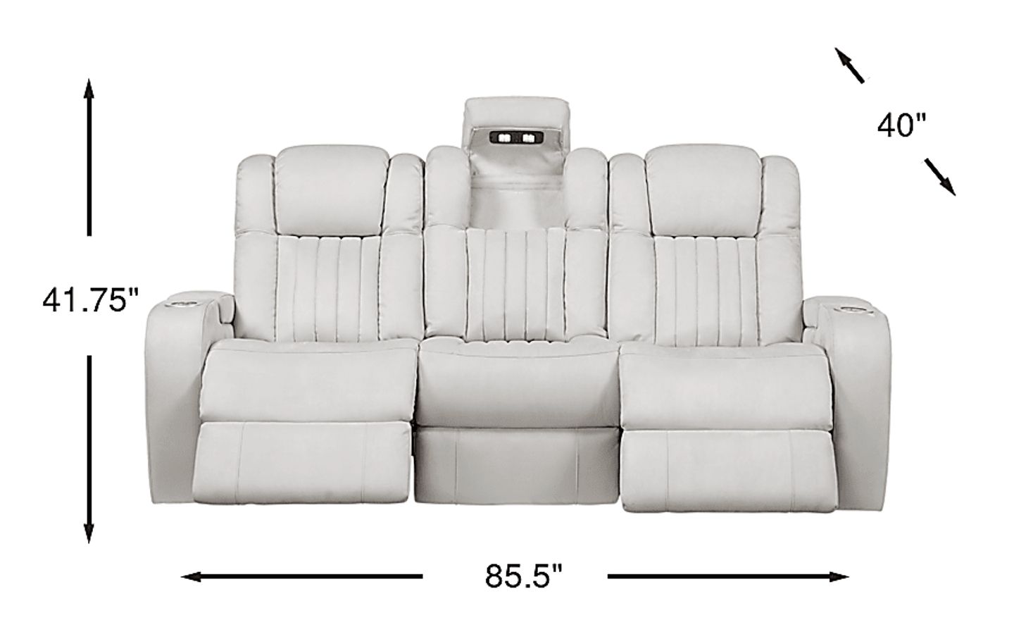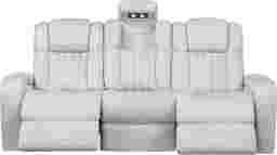Take lounging to the next level with the Servillo power reclining sofa. Packed with features, this contemporary white sofa is upholstered in luxurious top grain leather wherever the body touches. The middle seat remains stationary while the seating on each side boasts dual power reclining headrests and power chaise footrests. Deluxe features include touch activation and a memory switch for easily returning to favorite positions. The power headrest element provides three extra inches of back height that tilts forward to create the most comfortable position for watching television. A center-mounted fold-down table boasts twin cupholders and a pop-up media strip with two A/C adaptors. The center headrest can be raised to reveal handy reading lights. A USB port on each side of the sofa provides connectivity while hidden storage and lighted cupholders are conveniently built-in to each armrest. Top Grain Leather Where the Body Touches and Vinyl Sides and Backs.