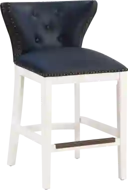 The Seyres counter stool gives a warm, updated cottage feel to your dining or bar space. The midnight blue leather gel seat is accented by the double antique brass nail head trim, button tufted back and white solid wood base. Solid wood stretchers provide stability and comfort and the antique brass kick plate protects the foot rest from wear. Customer assembly is required.