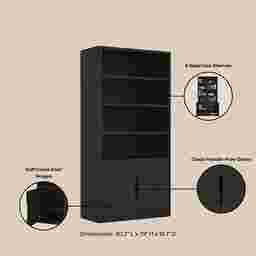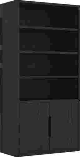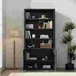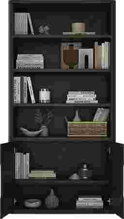 The Shadebooks IV black bookcase brings grounded elegance and tactile richness to modern interiors. With a focus on sculptural form and refined simplicity, each piece features clean lines, tailored silhouettes, and signature cutout pulls that double as subtle design statements. This bookcase is thoughtfully crafted with adjustable shelving and ample storage, offering functionality without compromising on style. Finished in warm, wood-grain tones, Shadebooks is designed to blend seamlessly into any space. Timeless yet distinctive, this piece offers a harmonious balance of quiet beauty and everyday utility. Customer assembly is required.