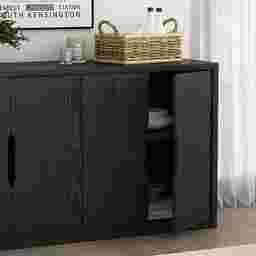 The Shadebooks V black sideboard brings grounded elegance and tactile richness to modern interiors. With a focus on sculptural form and refined simplicity, each piece features clean lines, tailored silhouettes, and signature cutout pulls that double as subtle design statements. This sideboard is thoughtfully crafted with adjustable shelving and ample storage, offering functionality without compromising on style. Finished in warm, wood-grain tones, Shadebooks is designed to blend seamlessly into any space. Timeless yet distinctive, this piece offers a harmonious balance of quiet beauty and everyday utility. Customer assembly is required.