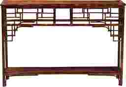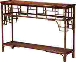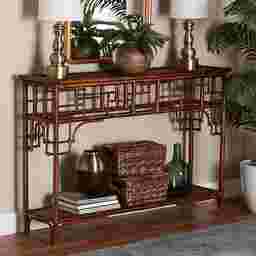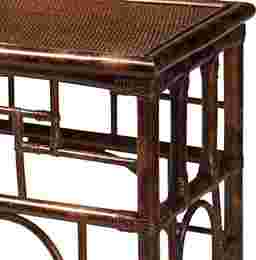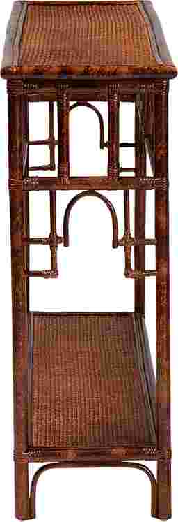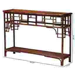 The Shadehat brown console table is an enchanting reimagining of antique Asian artistry. This bohemian piece is handcrafted from sustainably sourced natural rattan. An enchanting faux tortoise finish adorns the openwork rattan pole frame of the piece for a vibrant display from every angle. The Shadehat will arrive fully assembled and features a rectangular tabletop to display decorations while the lower shelf adeptly organizes larger items. Striking a poise of timeless luxury, the Shadehat console table is a delightful accent piece.