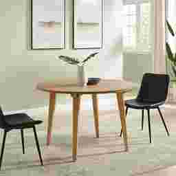 If your design destination is sleek, minimalist, and effortlessly stylish, look no further than this Shadeway dining table. Tapered legs and a simple silhouette lend the piece its signature Japandi aesthetic while its fixed, round tabletop marries function and form. Seat up to four friends around the richly textured, wood veneer top, and host your next charcuterie board party, card game, or family dinner with effortless elegance. With a sustainably sourced solid wood base and trendy yet timeless frame, this dining table is here to stay. Customer assembly is required.