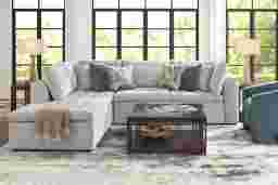 Take it easy in style when you bring home the Sheridan Place sectional from Cindy Crawford Home. Highlighted by tufted cushions and gray chenille upholstery, this sectional has a left arm facing chaise sofa and an armless sleeper. The right arm facing sleeper seamlessly pops up to create the perfect guest suite for overnight company. Loose back cushions add a distinct casualness to the piece. Upholstery: 100% Polyester. Cleaning Instructions: Use water based cleaning agents or foam.